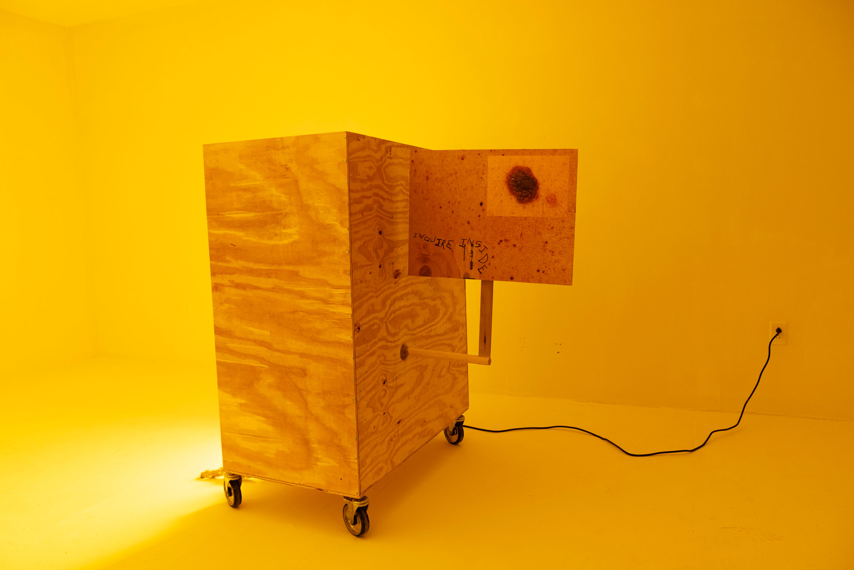 Plywood, paper, aluminum, speaker, 3:52 video loop